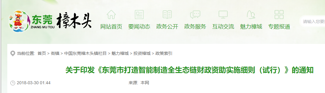 《東莞市打造智能制造全生態鏈財政資助實施細則(試行)》正式印發。對購買先進設備自動化改造的企業,資助標準提高至設備投入額的25%到50%以上,單個項目最高資助500萬元。