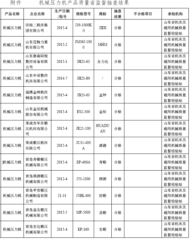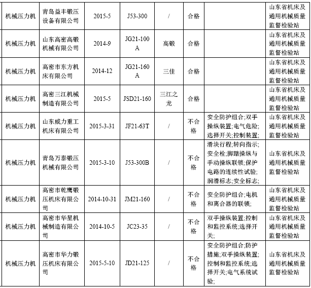13日,山東省質量技術監督局在其官網公布2015年第2批機械壓力機產品質量省監督抽查結果,有5家企業的5批次產品不符合相關標準的要求。